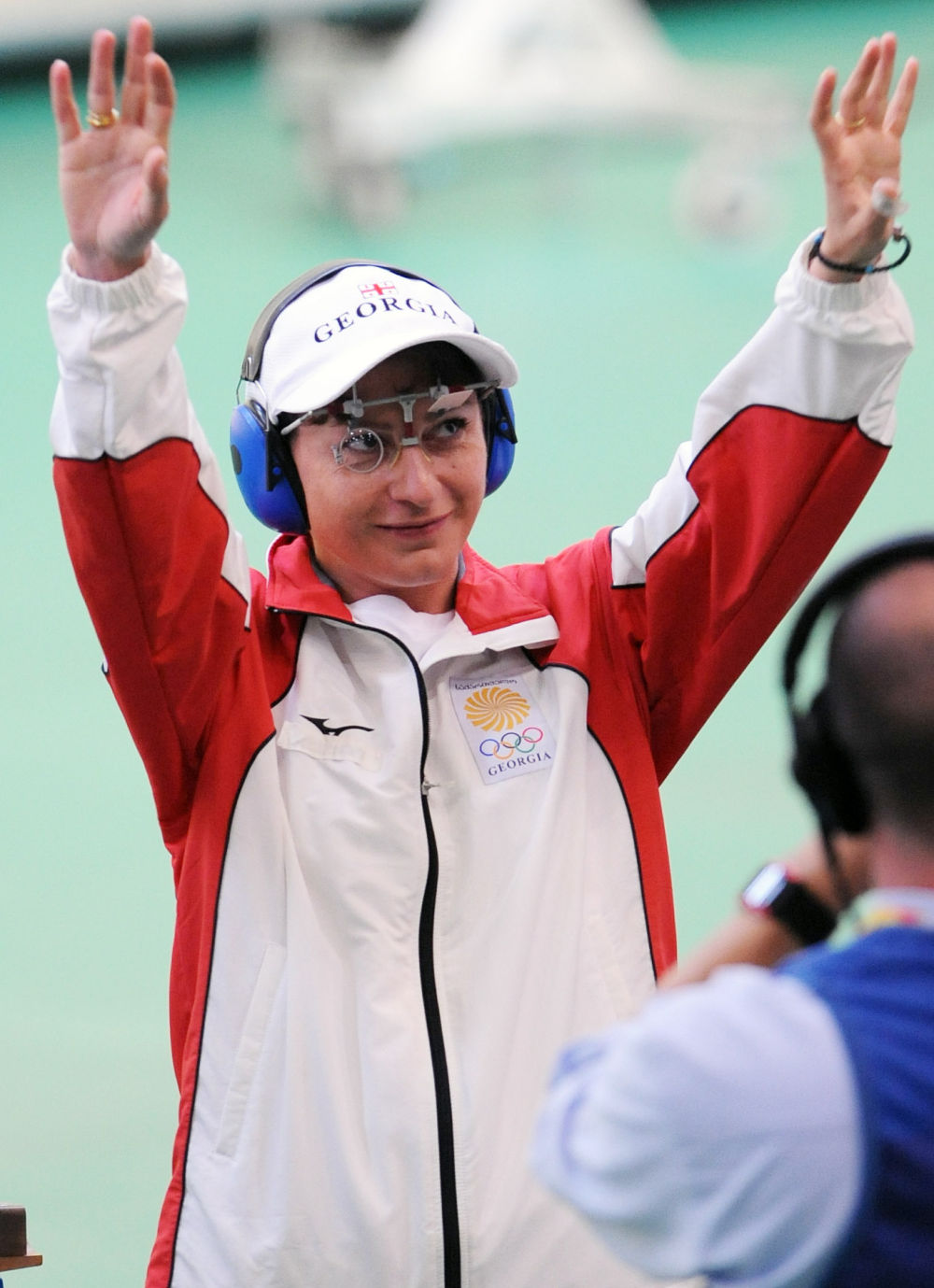 2008年8月10日,格鲁吉亚选手妮诺·萨卢克瓦泽赛后向观众挥手致意。当日,在2008北京奥运会上她获得女子10米气手枪铜牌。新华社记者 徐家军 摄