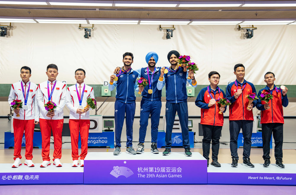 2023年9月28日,冠军印度队(中)、亚军中国队(左)和季军越南队在杭州亚运会男子10米气手枪团体项目颁奖仪式上合影。新华社记者 孙非 摄