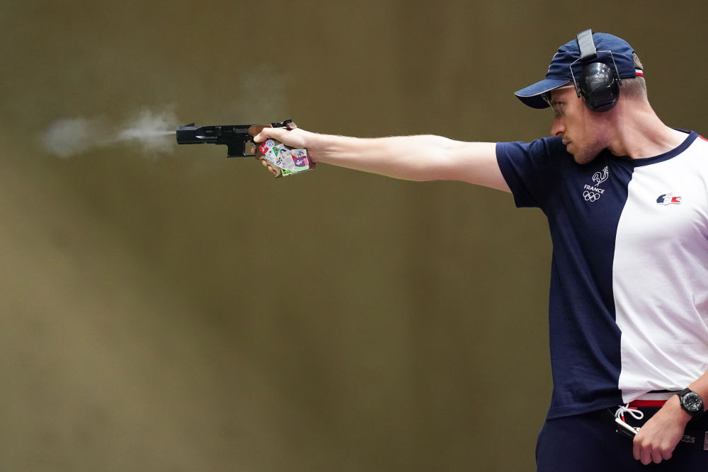 2021年8月2日,法国选手基康普瓦在比赛中。当日,在东京奥运会射击男子25米手枪速射决赛中,法国选手基康普瓦获得金牌。新华社记者 鞠焕宗 摄